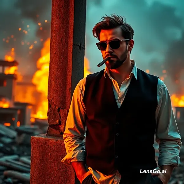 A cinematic slow-motion video of a serious man wearing a black vest, white dirty shirt and sunglasses, leaning against a broken concrete pillar in a burning city. He is smoking a cigar calmly while fire and explosions burn in the background. Sparks and embers floating in the air. Dramatic orange and blue lighting, intense atmosphere. The camera slowly pushes in toward his face, slight wind moving his hair and shirt. Fire flickering behind him, smoke moving naturally. Ultra-realistic, 4K, shallow