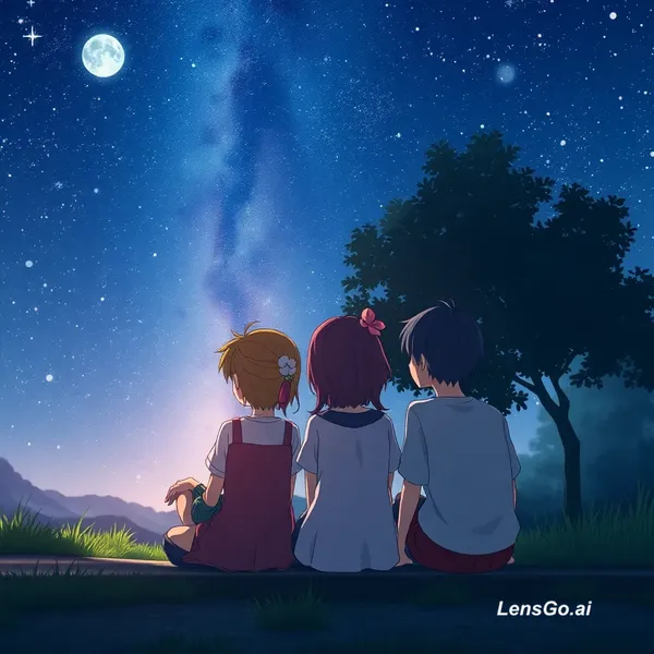 Anime cinematic scene of three friends sitting side by side on the roadside under a tree, silently enjoying the night. No one is speaking, but their bond feels strong. The Milky Way stretches beautifully across the sky, stars twinkling slowly. Soft moonlight falls on their faces, creating a calm and peaceful mood. Slight wind moves their hair and clothes. Depth of field, soft lighting, Studio Ghibli inspired, slow zoom, ultra detailed, 4K.
