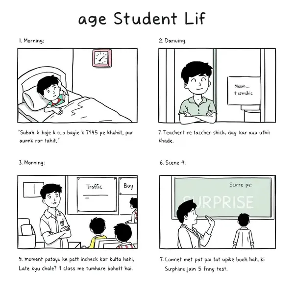 🎬 Storyboard – “Average Student Life” Scene 1 – Morning (5 sec) Drawing: Bed par boy so raha hai Alarm clock 7:45 dikh raha hai Voice: “Subah alarm 6 baje ka lagaya tha… par aankh 7:45 pe khuli.” Action: Boy shock me uthta hai. Scene 2 – School Gate (6 sec) Drawing: School gate Teacher arms cross karke khadi Dialogue: Teacher: “Late kyu aaye?” Boy: “Ma’am… traffic bohot tha.” Funny text: “Traffic = Bed” Scene 3 – Classroom Homework (7 sec) Drawing: Teacher copy check kar rahi 5 students khade Voice: “Us moment pe pata chalta hai ki class me tumhare jaise aur bhi legends hai.” Scene 4 – Surprise Test (6 sec) Drawing: Teacher board par likh rahi Board pe: SURPRISE TEST Voice: “Surprise test ka surprise sirf teacher ko pasand aata hai.” Students shocked face. Scene 5 – Lunch Break (7 sec) Drawing: Friends circle me baithe Tiffin open Dialogue: Friend: “Bhai kya laya hai?” Boy: “Paratha.” Action: Sab friends paratha kha lete hain 😅 Scene 6 – PT Period Cancel (6 sec) Drawing: Students excited. Teacher: “Aaj PT cancel… extra maths.” Action: Sab sad face. Scene 7 – Ending (5 sec) Drawing: Boy exam paper dekhta hai. Voice: “Game me pro… par exam me noob.” 💡 Extra tips (important): Character simple rak (round head cartoon) Expressions funny bana Sound effects add kar (shock, laugh, sad) Isi style ki simple relatable animations se creators