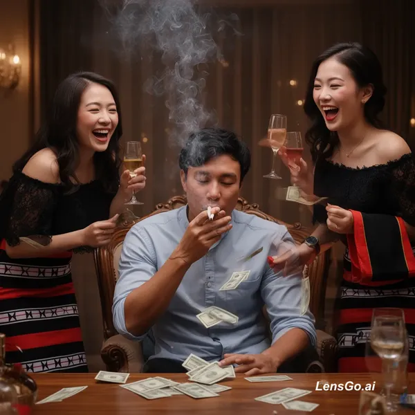 same people, realistic scene, man sitting in chair holding cigarette, puts cigarette in his mouth, slowly inhales and exhales smoke, smoke rising naturally, three women around him laughing and raising their glasses, elegant party atmosphere, then the man throws money on the table toward the women, subtle natural movement, no face change, realistic lighting
