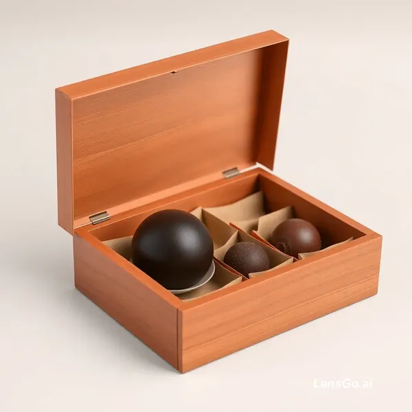 Photorealistic product render of a rigid two-piece packaging box consisting of a separate base and a fully removable lid (no hinge, no folding mechanism). The lid is placed slightly open next to the base to clearly show the structure. The box base measures 37.5 x 20 x 9.5 cm and is made of natural wood, painted with a water-based matte copper finish. The surface is soft, slightly uneven, artisanal, non-metallic, with visible brush texture and natural imperfections. Inside the base there are three modular kraft paper compartments, perfectly aligned side by side, minimal folded cardboard structure, no glue visible. In the first compartment: a large spherical chocolate ball (artisan chocolate sphere), matte dark chocolate finish. In the second compartment: another chocolate sphere. In the third compartment: a third chocolate sphere or a flat artisan chocolate piece for variation. Each product has a dedicated empty label space above it for printed chocolate descriptions (subtle minimal rectangular area integrated into the packaging design, elegant and aligned). The design has a Christmas aesthetic: subtle festive mood, warm tones, premium artisanal gift box feeling (not kitsch, no decorations like snow or glitter). Materials are realistic: kraft paper fibers visible, wood grain subtly visible under copper paint, chocolate slightly textured and matte.