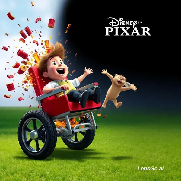 AI Image: Disney Pixar Posters Movie, Wheel chair exploded and Child is flying and Out tounge