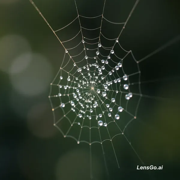 AI Image: Macro photograph of morning dew on spider web, bokeh background