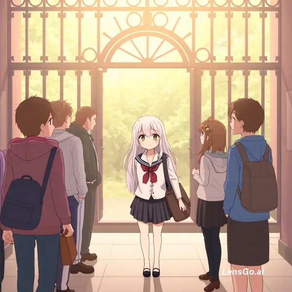 AI Image: Fais moi un anime de romance donc animation format manga-anime : Scène 1 – L’entrée du lycée (matin)