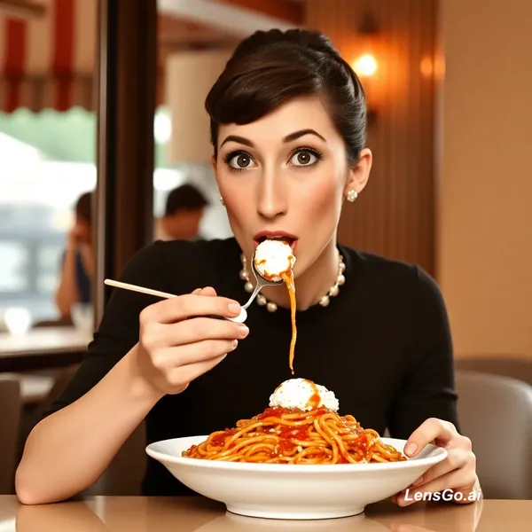 AI Image: Audrey Hepburn eating ice cream and spaghetti