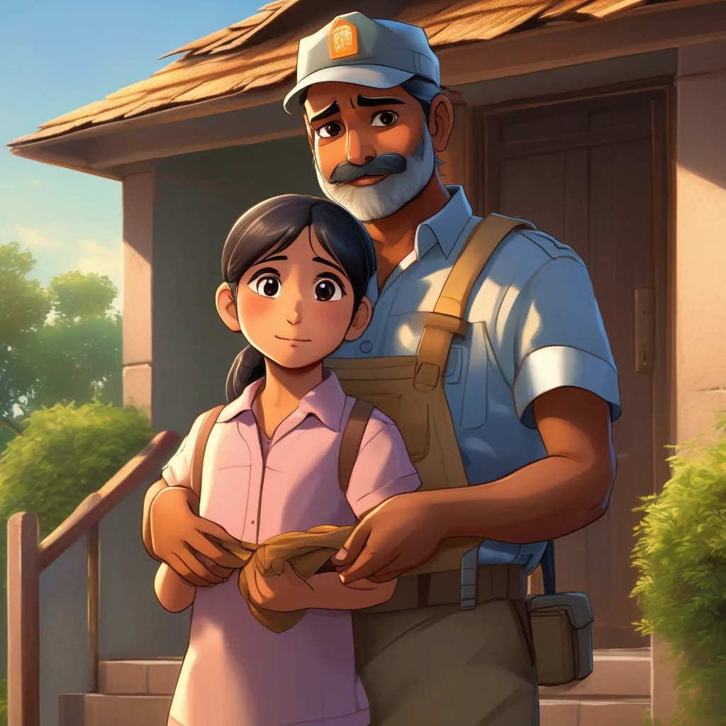 Realistic anime style, Indian construction worker father wearing duty uniform, no cap, no umbrella, standing outside a modest home in early morning light. His young daughter hugs him lovingly and secretly puts a small folded packet into his pocket. Emotional, warm lighting, soft expressions, cinematic anime realism, detailed faces, gentle breeze, family bond feeling.