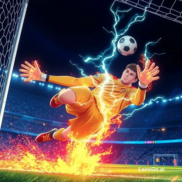 AI Image: Anime goalkeeper making an impossible flying save, electric energy around hands, dramatic slow motio
