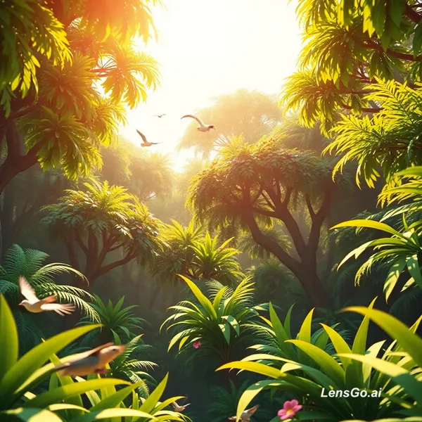 AI Image: "3D cartoon jungle, bright sunlight, green trees, जंगल का सुंदर वातावरण, birds flying, cinematic vie