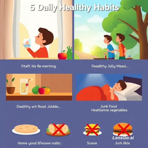 AI Image: "Create a 30-second animated video about '5 Daily Healthy Habits'. Scene 1 shows a young person drin