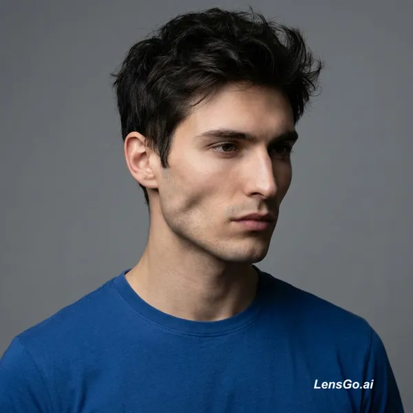Generate a high-fashion, high-resolution portrait based only on the pose and lighting of this image. Recreate the character with a completely distinct facial structure. While the general type (ethnicity/expression) remains similar, the new face must be unrecognizable. Re-sculpt the jawbone into a more chiseled shape, significantly alter the width and profile of the nose, and modify the cheekbone height. The resulting model must have a completely unique identity while maintaining the specific "Rembrandt" studio lighting and the solid blue t-shirt seen in the reference. Shot on 85mm lens.