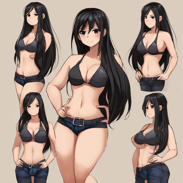 Una chica de anime en bikini con grandes pechos con pantalón de mezclilla y cabello negro atado en cola de caballo
