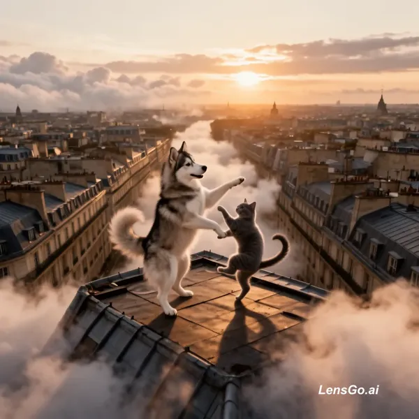 Cinematic aerial top shot looking down from the sky. The camera rapidly descends through the clouds towards a rooftop in a vintage European city during sunset. On the rooftop, a fluffy husky dog and a small gray cat are standing on their hind legs, dancing together gracefully. The cat twirls under the dog's arm. Warm golden hour lighting, soft shadows, slow motion, hyper-realistic, 8k resolution, film grain texture.