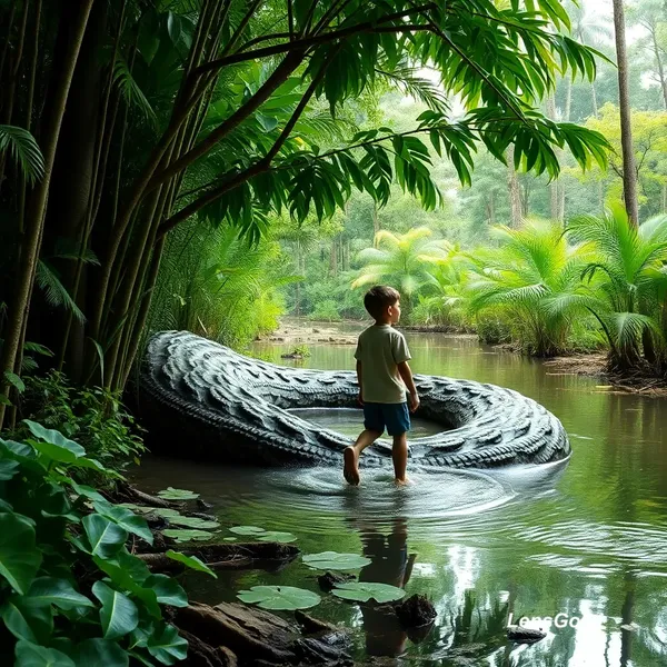 AI Image: A boy was walking through the Amazon rainforest when, suddenly, an anaconda emerged from behind and