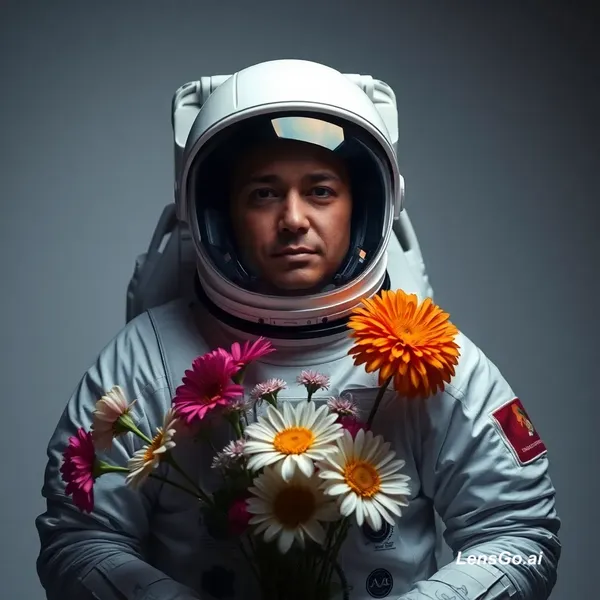 AI Image: Studio portrait of an astronaut holding flowers, dramatic lighting