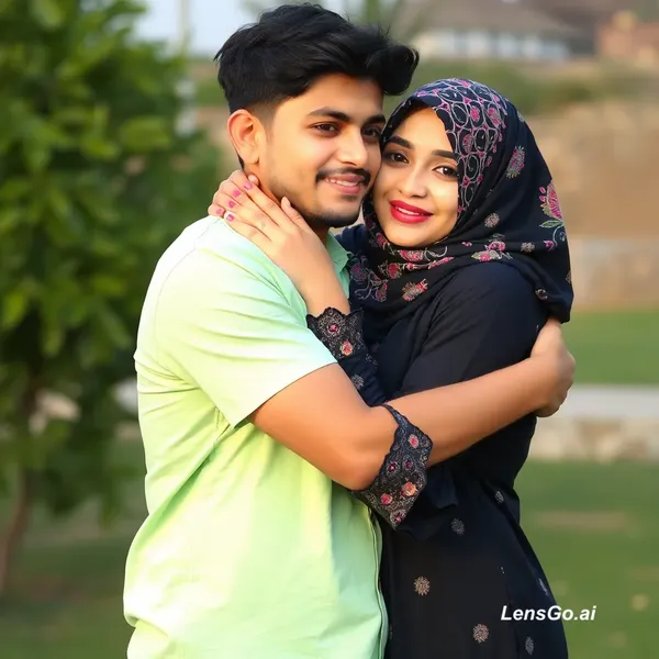 AI Image: a boy called zubair, and a girl called marokh hugs each other , make it beautifull because both are