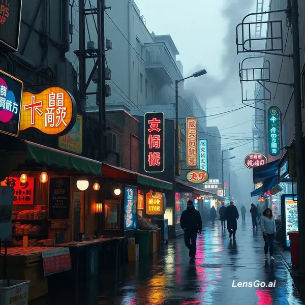 AI Image: Cyberpunk street market in the rain, neon signs and steam rising