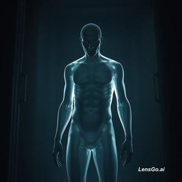 AI Image: same semi-human transparent human body character standing in dark prison environment, face slightly