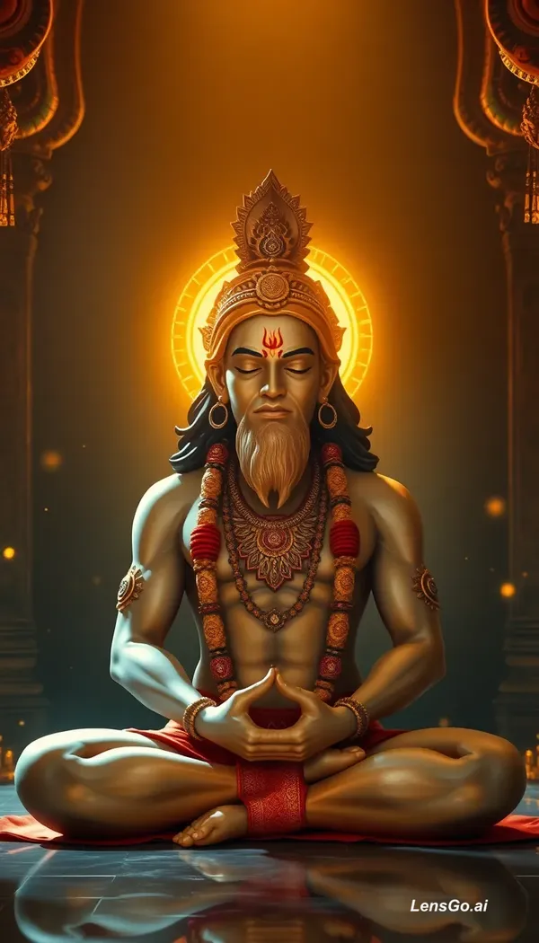 AI Image: Lord Hanuman meditating, peaceful face, golden aura, sitting in temple, राम नाम जाप, soft light, spi