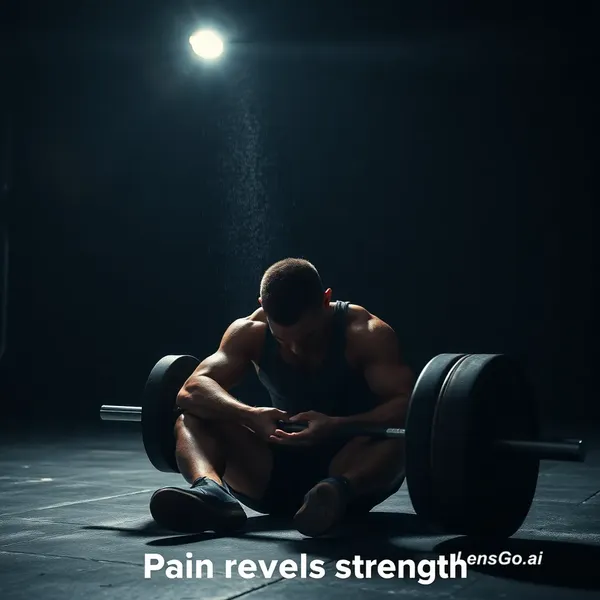 thlete alone in a dark gym at night, dim overhead spotlight casting deep shadows, failed lift moment with barbell dropping, echoing metal sound, athlete sitting on the floor exhausted, head down, sweat dripping heavily, close-up of shaking hands and clenched fists, chalk dust floating in the air, mirror reflection showing pain turning into determination, slow-motion sweat drops hitting the floor, athlete slowly stands up, intense eye focus, begins lifting again, muscles trembling, veins visible, explosive reps, low-angle shots for power, tight close-ups for emotion, fast cuts synced with a rising bass workout track, cinematic color grading (deep blacks, warm highlights), final shot-athlete standing tall under spotlight, calm but powerful, text overlay: "Pain reveals strength."