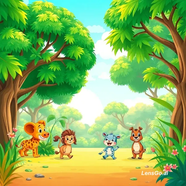 AI Image: A colorful cartoon jungle, big green trees, नदी, cute animals walking, bright sunlight, kids cartoon