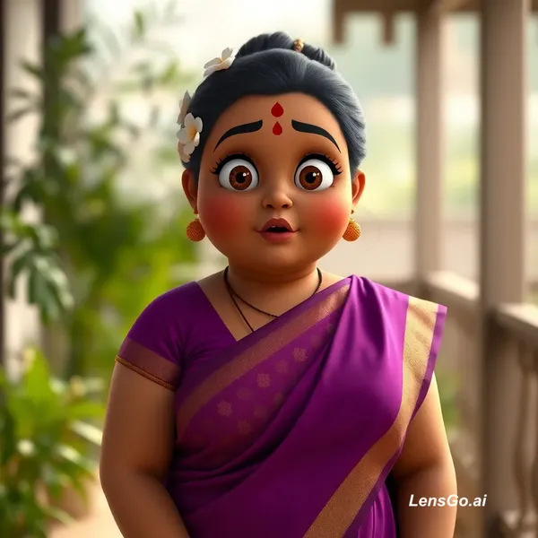 Ultra-realistic 8k cinematic mid-torso portrait of a beautiful, chubby Indian woman with a soft cartoon touch. She has large, expressive human-like eyes and a surprised facial expression. She wears a traditional purple silk saree with a gold border and a red bindi. Her black hair is in a bun with fresh white jasmine flowers. Soft outdoor natural lighting on a balcony with blurred green plants in the background. High detail, smooth skin texture, 3D character design.