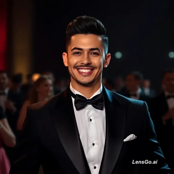 AI Image: Ohon imtiaz with a stylish haircut, wearing a modern black tuxedo, charismatic smile, volumetric lig