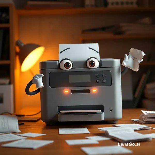 A Pixar-style 3D render of a cute, slightly chubby printer sitting on a study desk. It has big expressive digital eyes on its front panel, slightly raised worried eyebrows, and a mouth formed by the paper output slot showing mild frustration. Two flexible cable-like arms extend from its sides, one holding a crumpled paper and the other gesturing in complaint. The printer has glowing buttons like a face panel, softly blinking. Around it are scattered papers, some printed correctly and some jammed halfway. The scene is lit with warm indoor lighting, with a slight dramatic spotlight highlighting the printer’s emotional struggle. Dust particles float in the air, giving a cinematic Pixar feel.