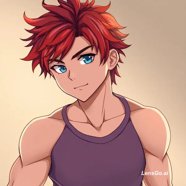 Prompt: “Anime-style teenage boy with striking red hair, piercing blue eyes, and a charismatic, handsome face. Athletic and muscular build with toned arms and a confident stance. Wearing a modern casual outfit with a subtle heroic flair. Soft, cinematic lighting highlighting his features and muscles. Dynamic pose, slightly wind-blown hair, detailed shading and anime-style line art, vibrant colors, highly detailed face and hair, realistic anime proportions.”