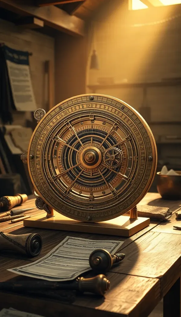 A realistic reconstruction of the Antikythera Mechanism in ancient Greece, bronze analog computer fully assembled, rotating gears, mathematical markings engraved, placed on a wooden table in an ancient Greek workshop, scrolls and tools around, warm natural sunlight, cinematic realism, ultra detailed, historical accuracy