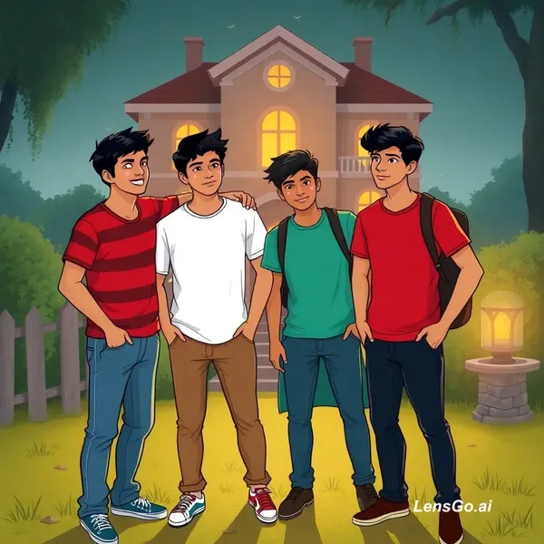 AI Image: Four friends—Ravi, Sonu, Aman, and Deepak—gathered courage… “Tonight, we will go inside the mansion,