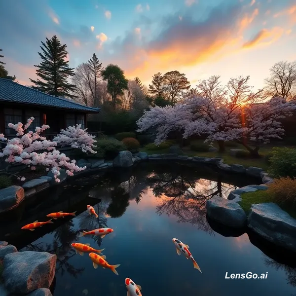 AI Image: A serene Japanese garden at golden hour, koi pond reflecting cherry blossoms