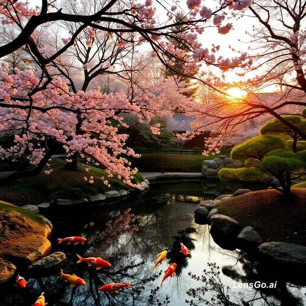 AI Image: A serene Japanese garden at golden hour, koi pond reflecting cherry blossoms
