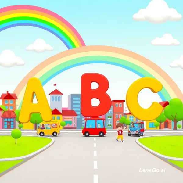 Scene 1 – Intro Animation Prompt: Colorful kids city, rainbow sky, clouds smiling, big letters A B C appear one by one, cute vehicles driving around, happy music vibe, camera slowly zooming in, children waving, playful animation.