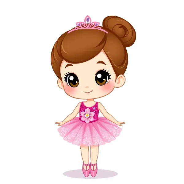 A cartoon illustration of a young ballerina with brown hair styled in an elegant bun, adorned with a pink tiara. She is wearing a sparkling pink tutu dress featuring a floral embellishment on the bodice and a glittery skirt. Her ballet shoes are also pink, complementing her overall outfit. The character has large expressive eyes, long eyelashes, and a gentle smile.