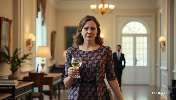 AI Image: the lady in the picture is walking ahead with elegant , confident style, and stops beside a desk the