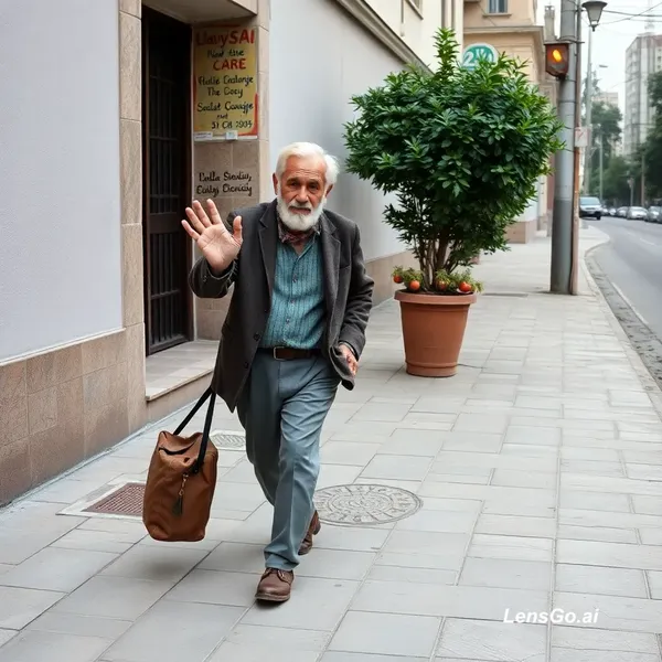 AI Image: An old man walking slowly. His right hand say hello still walking