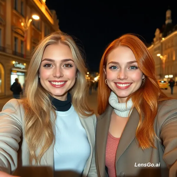“Use the uploaded photo as the main reference and keep the same face, same facial structure, same eyes and lips. Create a realistic iPhone night selfie of two twin-like girls in Switzerland, one blonde and one redhead. They should both look like the person in the reference photo. Stylish outfits, smiling, Swiss city lights at night, natural iPhone selfie, realistic skin, candid photo.”