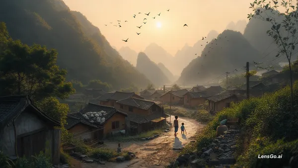 AI Image: Chhota sa gaon, pahadon ke beech Subah ka samay tha. Suraj ki pehli kirne gaon par gir rahi thi. Bir