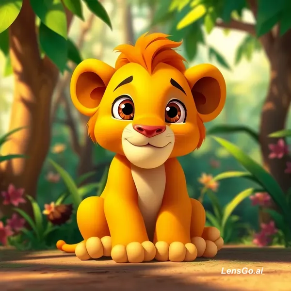 AI Image: 3D cartoon style cute baby lion sitting in colorful jungle, soft sunlight, big expressive eyes, chil