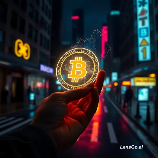 dark, futuristic city at night, neon lights reflecting on wet streets. A close-up of a hand holding a glowing holographic coin that spins rapidly. Camera pushes in as the coin emits digital particles and transforms into a floating crypto chart surging upward. Cinematic lighting, ultra-realistic, shallow depth of field, high contrast, 4K, smooth motion.”