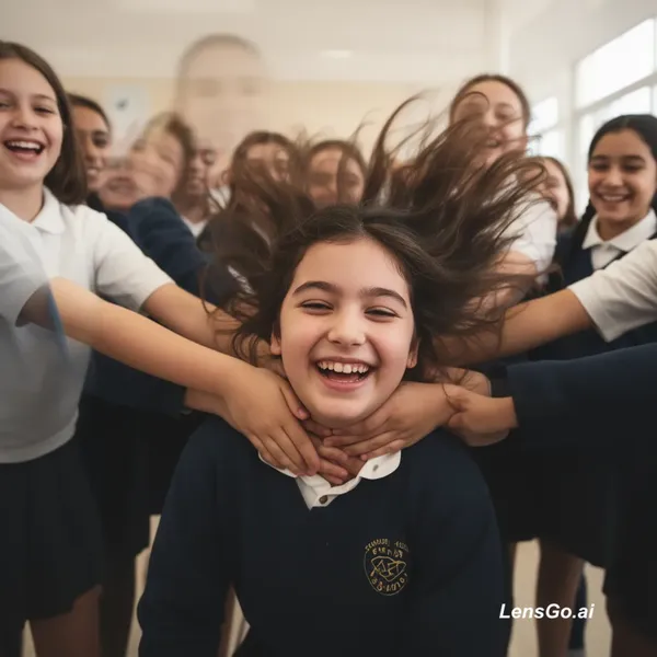 The girl in the blue circle named Sofia laughing and squirming as she is being tickled, playful motion, hair flying, joyful atmosphere by a group of people from school.