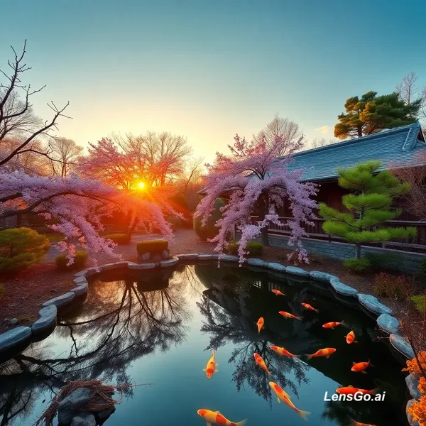 AI Image: A serene Japanese garden at golden hour, koi pond reflecting cherry blossoms