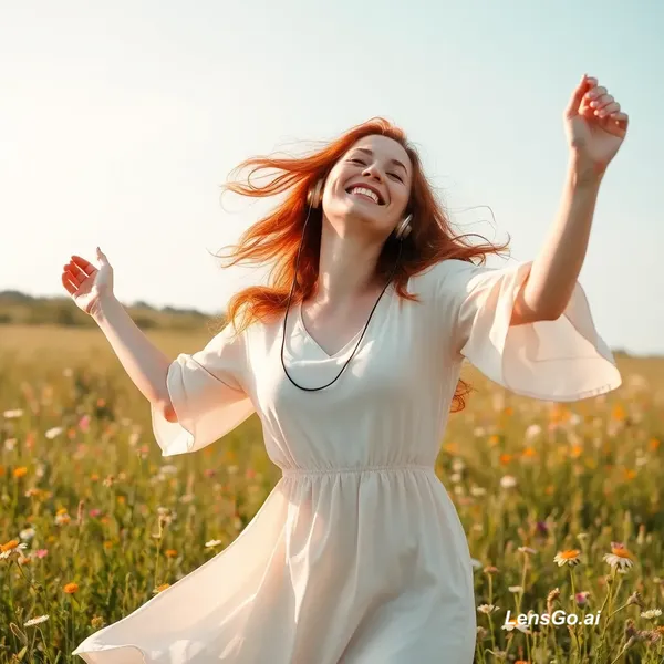 A joyful red-haired woman dancing freely in a flower-filled meadow under a clear blue sky, wearing flowing light dress and wireless headphones, her eyes closed, smiling, hair and fabric moving in the wind, dreamy natural light, soft focus, ethereal mood, wildflowers all around, sense of freedom and presence