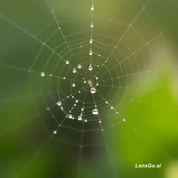 AI Image: Macro photograph of morning dew on spider web, bokeh background