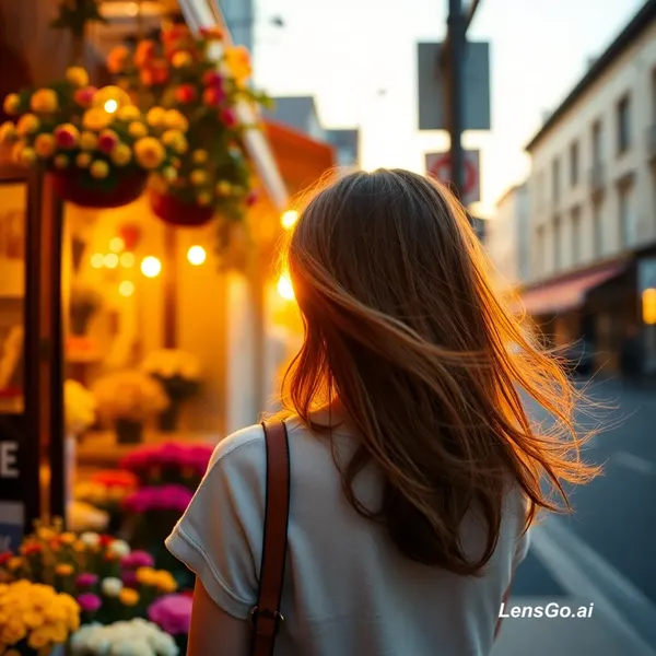 AI Image: Slow camera push-in toward girl standing at flower shop, warm sunset light flickering, slight moveme
