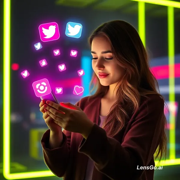 young woman using smartphone, social media icons floating, instagram followers increasing animation, digital marketing concept, neon background, cinematic lighting”