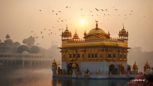 AI Image: Cinematic 3D cartoon animation, sunrise over Ayodhya kingdom, golden palace glowing, मंदिर की घंटिया