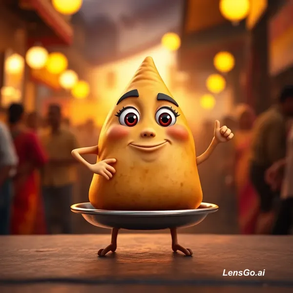 Pixar-style 3D render of a golden, crispy samosa standing upright on a small steel plate. Eyes: warm, expressive almond-shaped eyes with a confident sparkle Eyebrows: slightly arched in pride Mouth: cheeky half-smile with a tiny smirk of spice Arms: one hand on hip, the other pointing dramatically like it's making a bold statement Legs: tiny sturdy legs planted firmly Scene: Bustling Indian street food stall at sunset, warm orange glow, steam rising in slow motion, blurred crowd in the backgroun