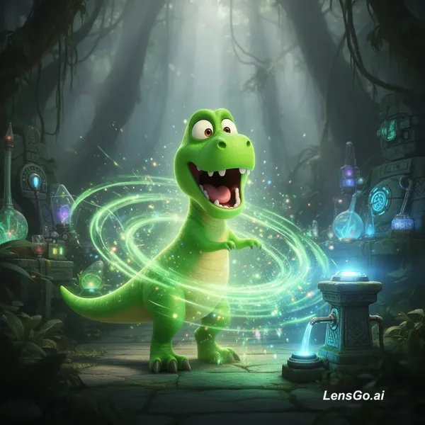 π¬ SCENE 1 β The Shrinking Moment (Hook) Prompt: A funny-looking bright green cartoon T-Rex named Rex, with smooth vibrant green scales, lighter green belly, big round expressive eyes, slightly oversized head, tiny arms, thick tail, and a goofy playful face, a talkative and highly expressive character mid-speech, standing inside a dense jungle laboratory filled with mysterious glowing elements and ancient stone technology, Rex pressing a glowing futuristic button on a small stone pedestal, the button emitting intense neon blue and green light, magical energy explosion radiating outward, shockwave of light particles and energy rings expanding, Rex beginning to shrink rapidly with magical distortion effect, his face showing extreme shock and humor as if shouting, glowing particles swirling around him, jungle trees towering in the background, cinematic fog, volumetric light beams, motion blur, dramatic lighting, depth of field focusing on Rexβs face, vibrant Pixar-style animation, ultra-detailed textures, whimsical and funny tone, Ultra-detailed 10K cinematic animation, Pixar-style 3D, volumetric lighting, depth of field, ultra-sharp focus, dramatic shadows, global illumination, highly detailed textures, soft cinematic glow, dynamic camera angles, shallow depth of field, expressive character, 8kβ10k resolution, high contrast, cinematic storytelling, hyper-realistic environment, no text, no watermark