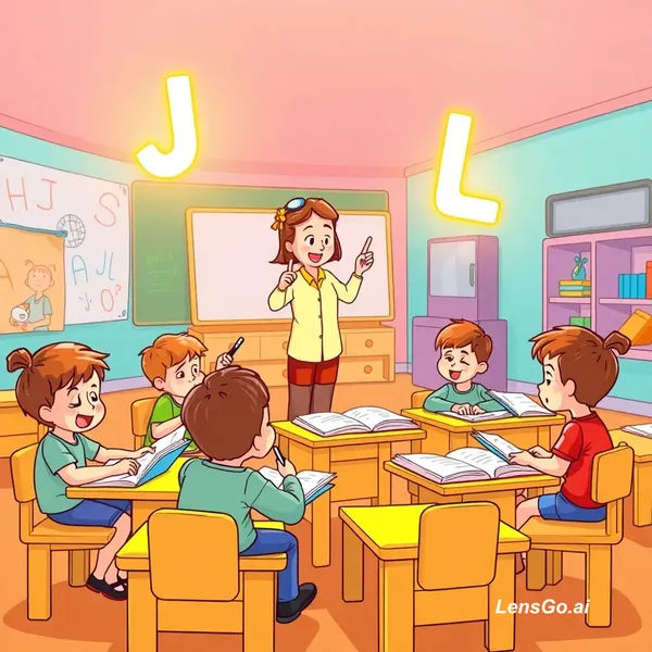 AI Image: Children reading books at small desks, glowing letters I J K L floating above them, teacher explaini